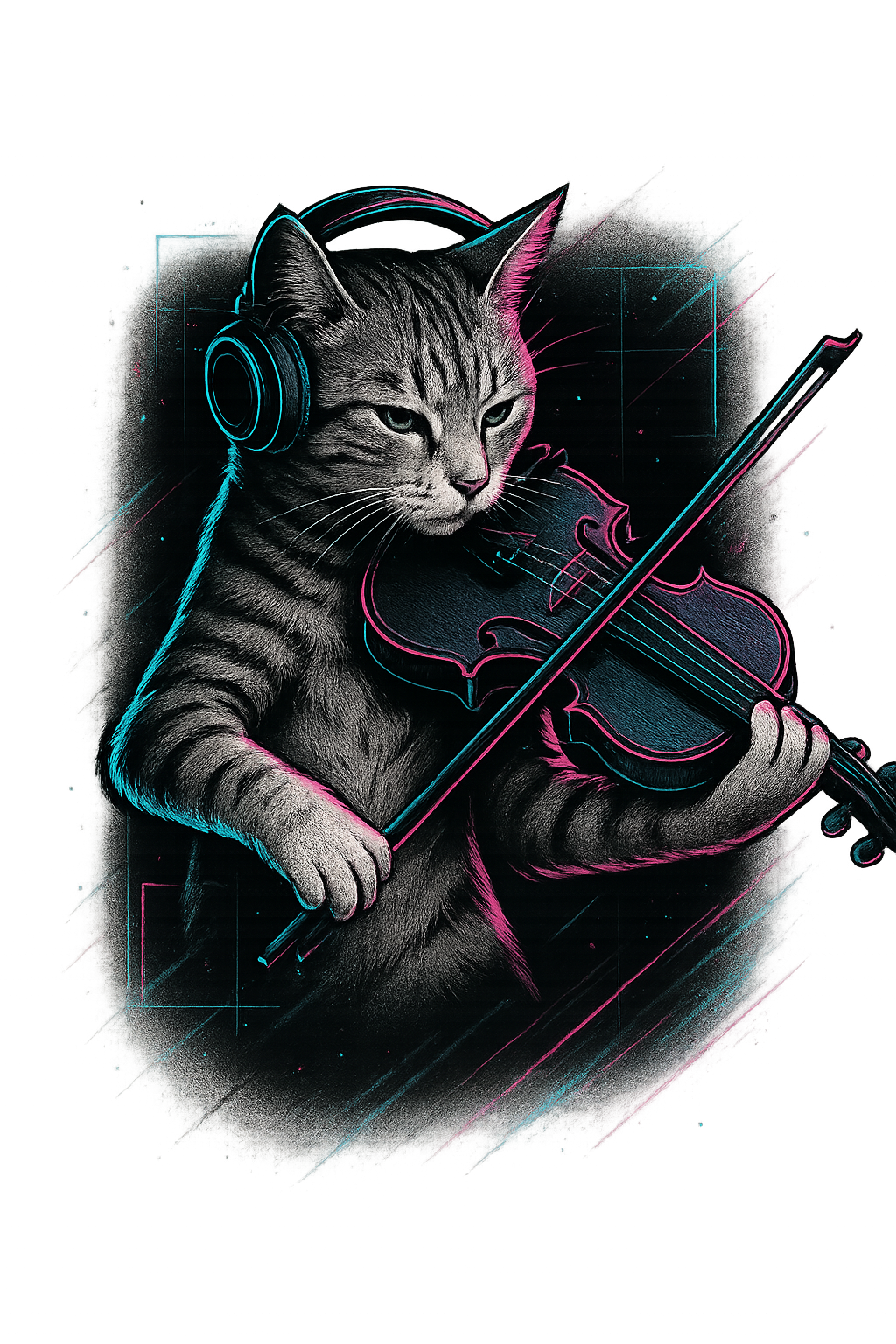 Cyberpunk cat, glowing segmentation lines, electric fiddle